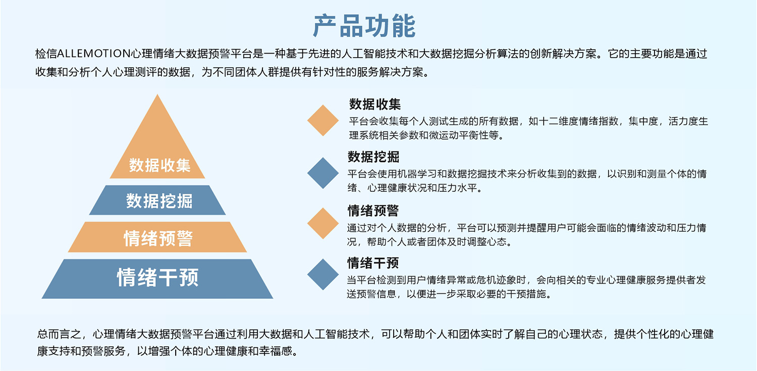 檢信ALLEMOTION心理情緒測評系統為心理情緒大數據預警平臺提供了有效的數據服務,推動我國建立全民心理情緒健康大數據預警管控平臺。它結合了心理學、人工智能和大數據分析,旨在通過收集、分析和解讀用戶的語音、文字和行為數據,提供情緒監測和預警服務。這種平臺的出現,為心理健康領域帶來了新的機會和挑戰。該領域的市場潛力巨大。許多公司和研究機構已經開始研發和推出各種心理情緒大數據預警平臺,并在醫療、教育、企業管理等領域進行試點應用。